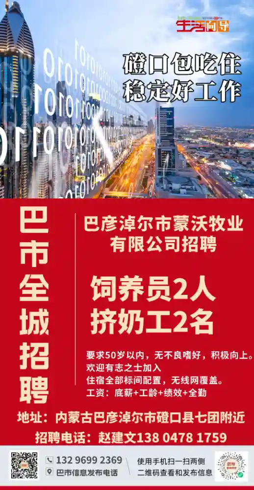 关键字:磴口牧场包吃住招聘饲养员