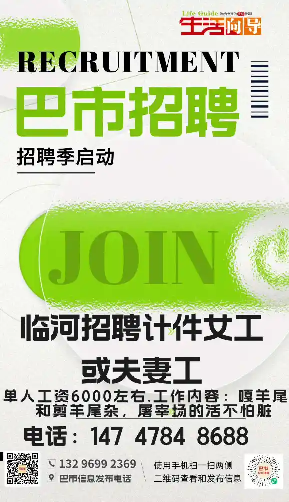 关键字:临河招聘计件女工或夫妻工