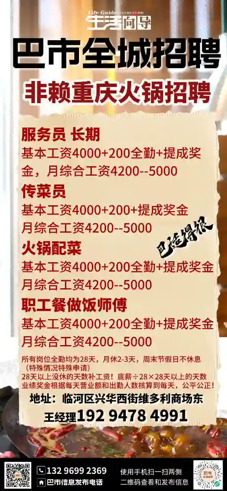 关键字:临河诚聘服务员、传菜员、火锅配菜、职工餐做饭师傅、保洁员
