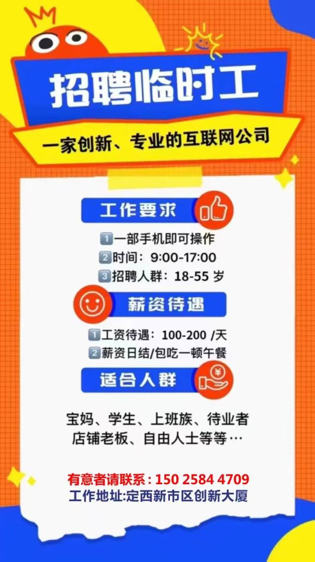 🔻中午食堂免费管餐。参加人员须1965-2003年的出生的。22-60岁。小学以上文化程度。认识26个英文字母。会玩智能手机。一天综合120-150左右。