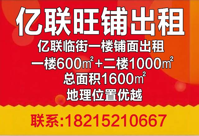 旺铺出租!亿联临街黄金铺,无转让费直接营业