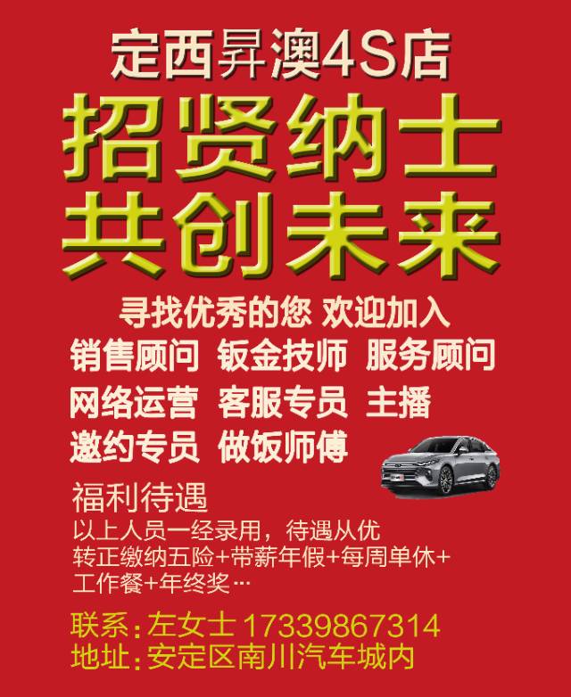 定西中国一汽4S店高薪招聘: