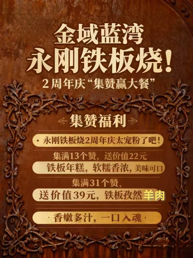 ➡️地址:#金域蓝湾永刚铁板烧!2周年庆”#集赞赢大餐”。