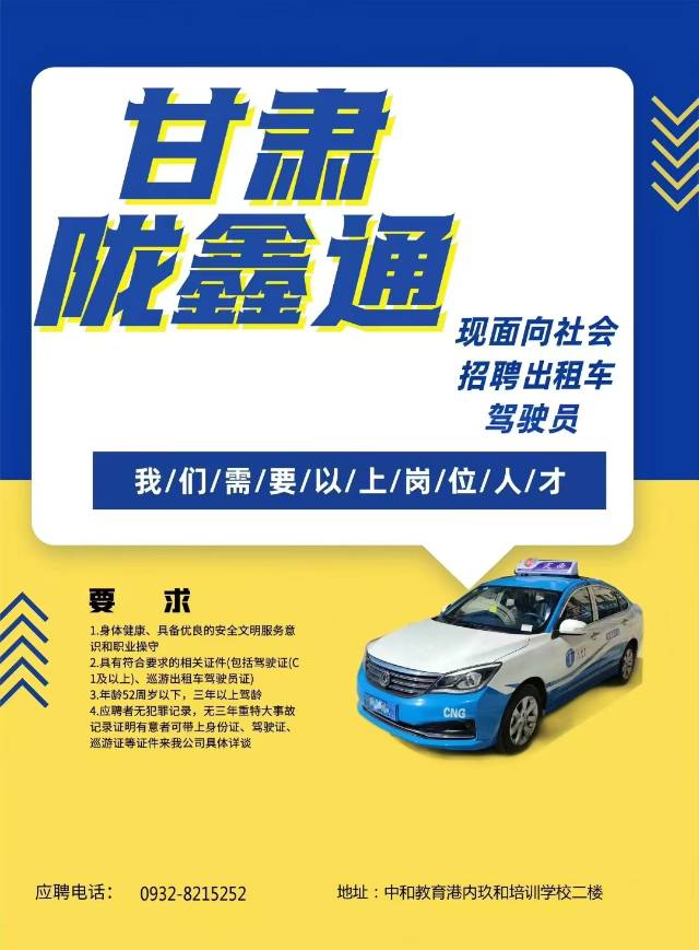 👉🏿甘肃陇鑫通运输服务有限公司现面向社会招聘巡游出租车驾驶员数名:
