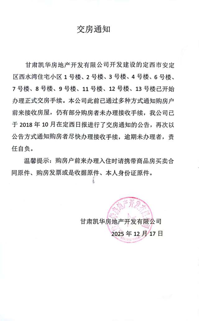 甘肃凯华房地产开发有限公司开发建设的定西市安定区西水湾住宅小区1号楼,2号楼,3号楼,4号楼,6号楼,7号楼,8号楼,9号楼,11号楼,12号楼,13号楼已开始办理正式交房手续。本公司此前已通过多种方式通知购房户前来接收房屋,仍有部分购房者未办理接收手续,我公司已于2018年10月在定西日报进行了交房通知的公告,再次以公告方式通知购房者尽快办理接收手续,逾期未办理者,责任自负。
