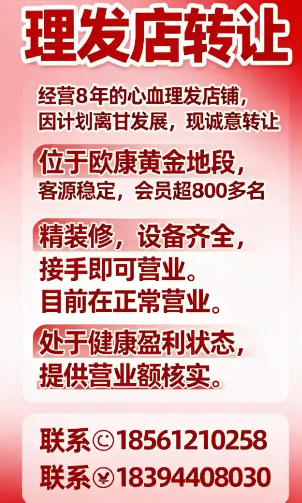 经营8年的心血【理发】店铺,因计划离甘发展,现诚意转让。