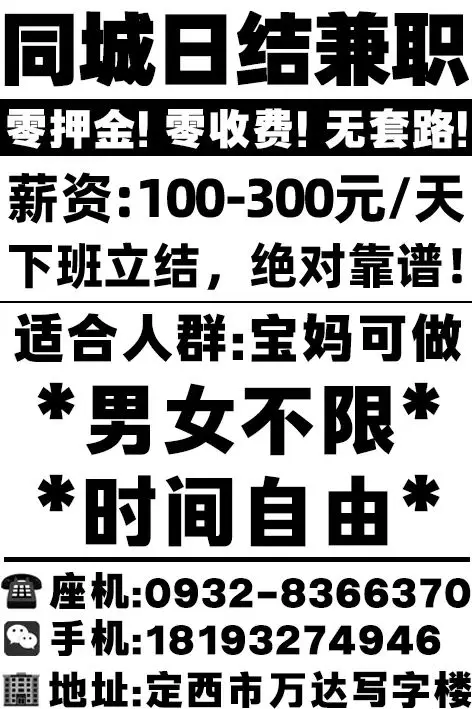 定西同城日工资100-300 1⃣长期招聘兼职日结人员