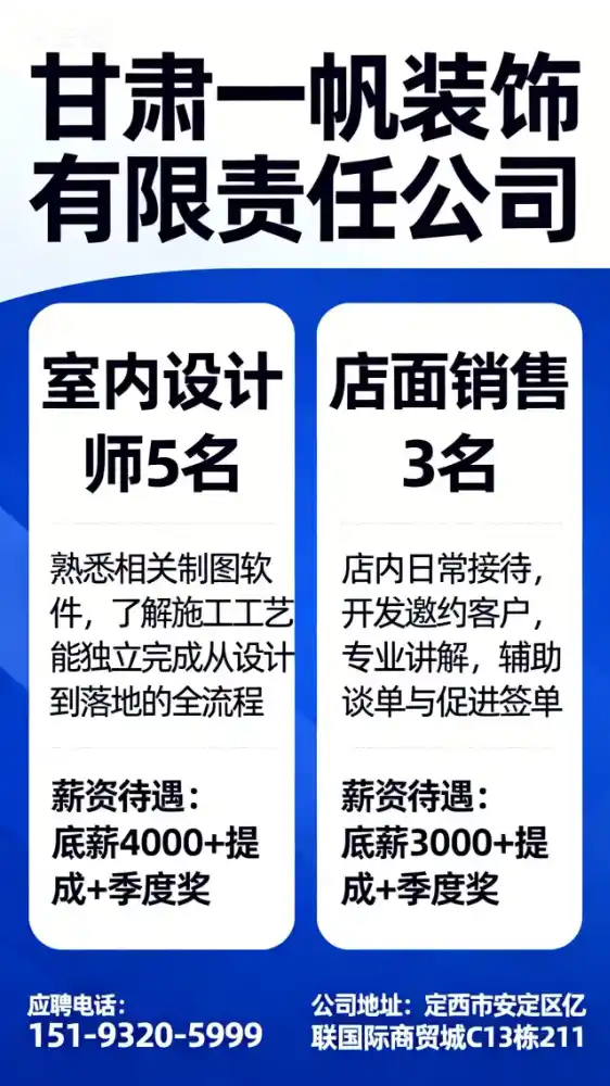 👉🏿甘肃一帆装饰有限责任公司高薪诚聘