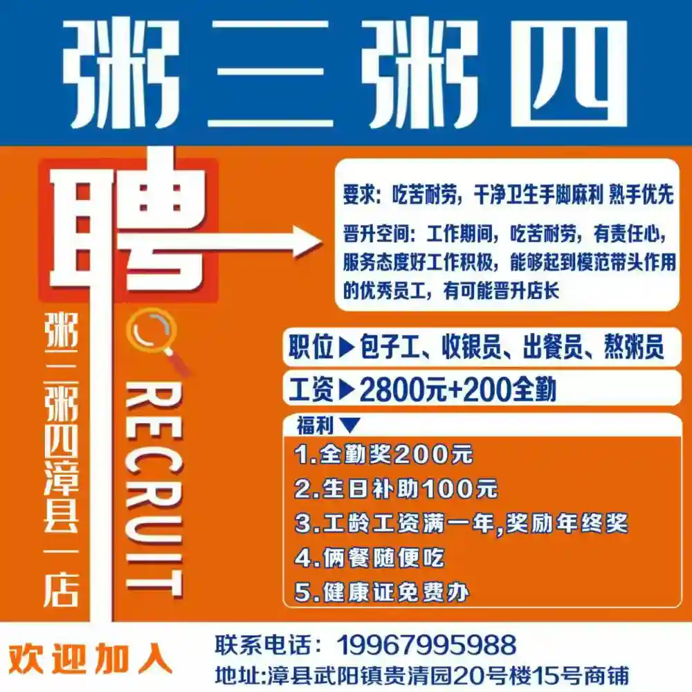 🍀🍀漳县【粥三粥四】招聘