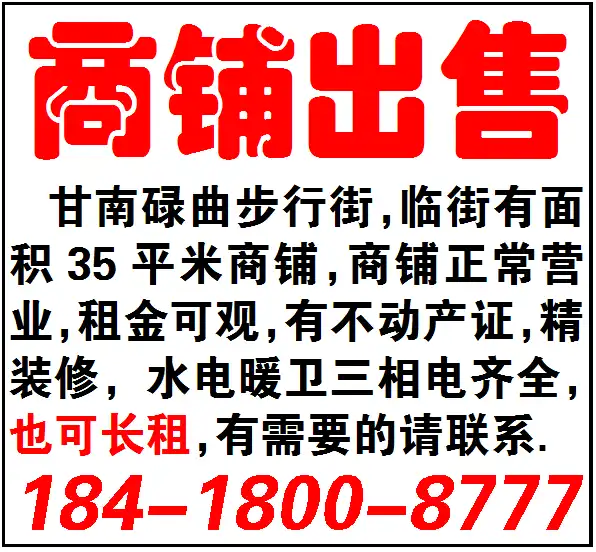 甘南碌曲步行街,临街有面积35m2商铺,商铺正常营业,租金可观,有不动产证,精装修,水电暖卫三相电齐全,也可长租有需要的请联系。184-1800-8777
