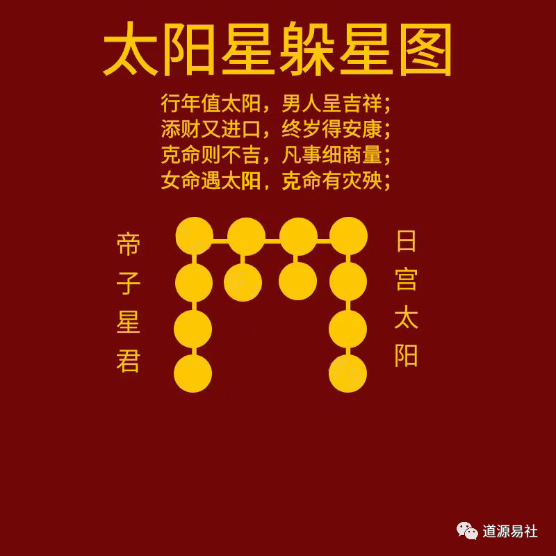 1、太阳星吉星(代表盛运。万事吉。远行有财,大人见喜,添人进口,万事和合。但女人不喜此星,解化方吉。还要防冬季有失或不顺,因此,此星男人要顺星,女人要躲星。)