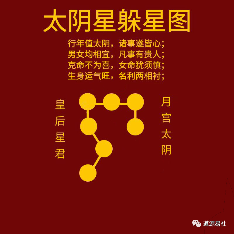 2、太阴星吉星(进运。见官有理。凡事遂心。女人有疾厄、产患之难。如果做事时知其进退,定会成功,男人要顺星,女人要躲星。)