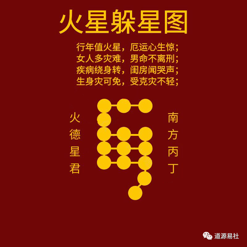 9、火星凶星(休运。主疮疾。女人产难血光,男人官灾不利。人口不安,六畜不旺,自宜谨慎。进退两难,不可强行,男人要顺星,女人要躲星。)