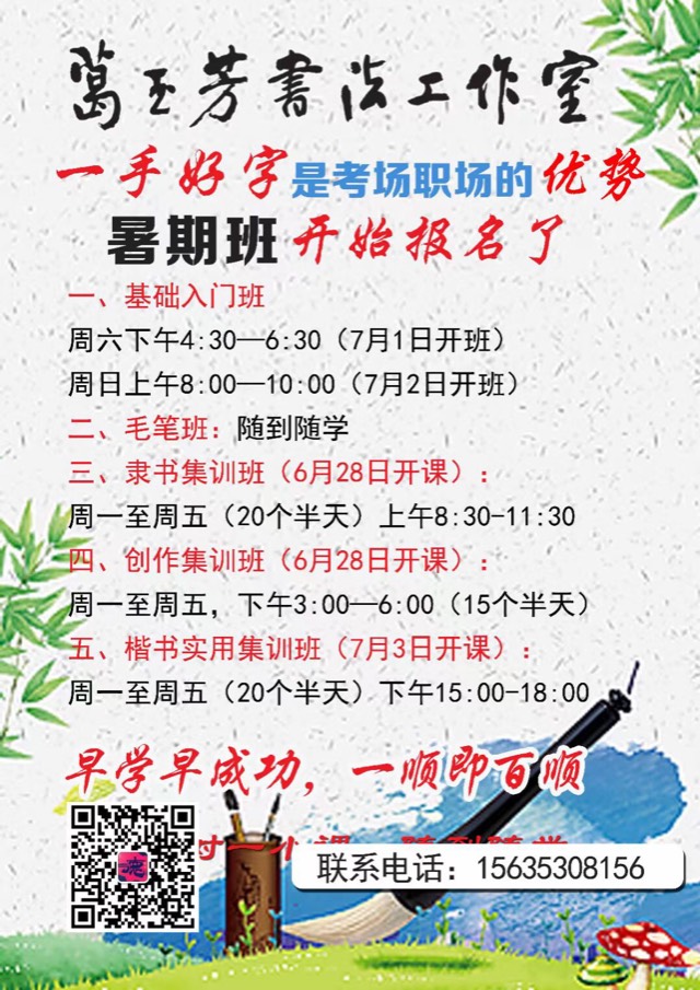 葛玉芳书法工作室,暑期增开“实用楷书”集训课程,定于7月3开课,从周一到周五每天下午3点—6点(20个半天),凡小学高年级及中学生都可报名
