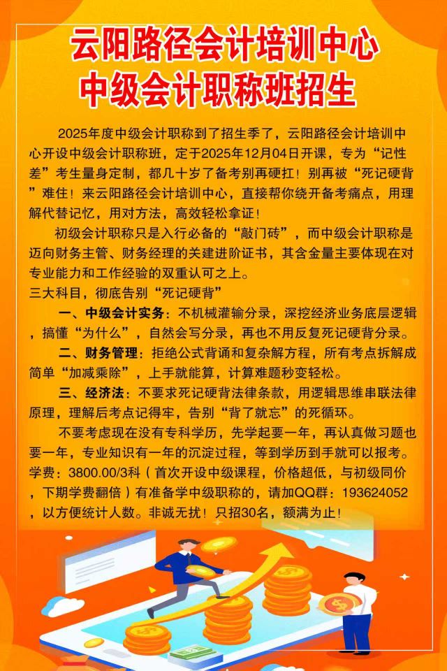 2026年度中级会计职称到了招生季了,云阳路径会计培训中心开设中级会计职称班,定于2025年12月04日开课,专为“记性差”考生量身定制,都几十岁了备考别再硬扛!别再被“死记硬背”难住!来云阳路径会计培训中心,直接帮你绕开备考痛点,用理解代替记忆,用对方法,高效轻松拿证! 初级会计职称只是入行必备的“敲门砖”,而中级会计职称是迈向财务主管、财务经理的关建进阶证书,其含金量主要体现在对专业能力和工作经验的双重认可之上。
