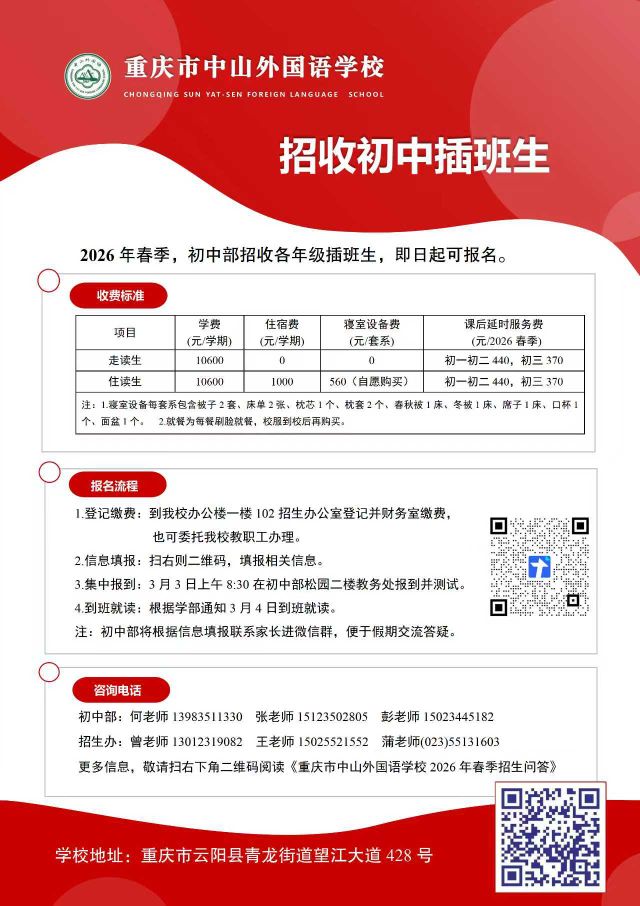 重庆市中山外国语学校 CHONGQING SUN YAT.SEN FOREIGN LANGUAGE SCHOOL 招收初中插班生 2026年春季,初中部招收各年级插班生,即日起可报名。 收费标准 项目学费(元/学期)住宿费(元/学期)寝室设备费(元/套系)课后延时服务费(元/2026春季) 走读生 10600 0 0 初一初二440,初三370 住读生 10600 1000 560(自愿购买) 初一初二440,初三370 注:1。寝室设备每套系包含被子2套,床单2张,枕芯1个,枕套2个,春秋被1床,冬被1床,席子1床,口杯1个,面盆1个,2。就餐为每餐刷脸就餐,校服到校后再购买。 报名流程 1。登记缴费:到我校办公楼一楼102招生办公室登记并财务室缴费, 也可委托我校教职工办理。 2。信息填报:扫右则二维码,填报相关信息。 3。集中报到:3月3日上午8:30在初中部松园二楼教务处报到并测试。4。到班就读:根据学部通知3月4日到班就读。 注:初中部将根据信息填报联系家长进微信群,便于假期交流答疑。 咨询电话 初中部:何老师13983511330张老师15123502805彭老师15023445182 招生办:曾老师13012319082 王老师 15025521552蒲老师(023)55131603 更多信息,敬请扫右下角二维码阅读《重庆市中山外国语学校2026年春季招生问答》 学校地址:重庆市云阳县青龙街道望江大道428号