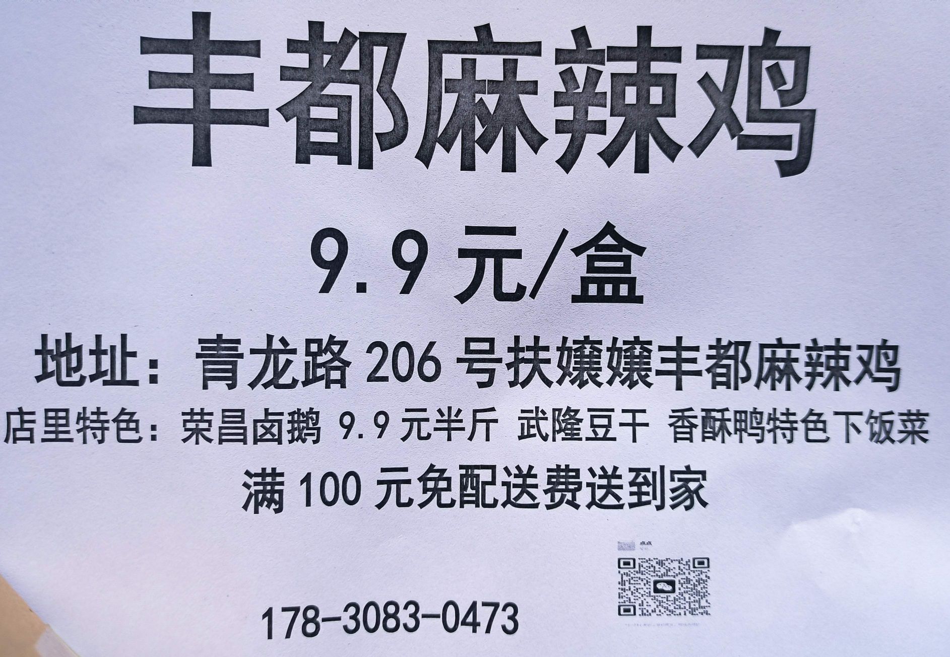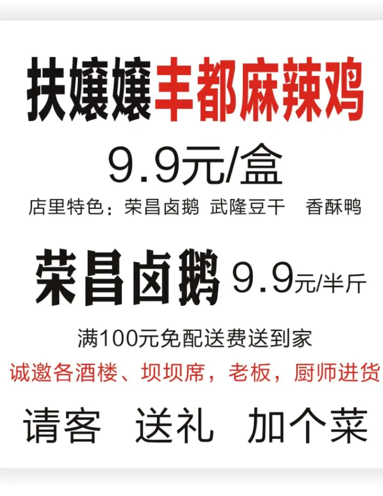 丰都麻辣鸡 9.9 元/盒,欢迎大家选购! 地址:青龙路 206 号扶嬢嬢丰都麻辣鸡 店里特色:荣昌卤鹅 9.9 元半斤武隆豆干香酥鸭特色下饭菜 满 100 元免配送费送到家